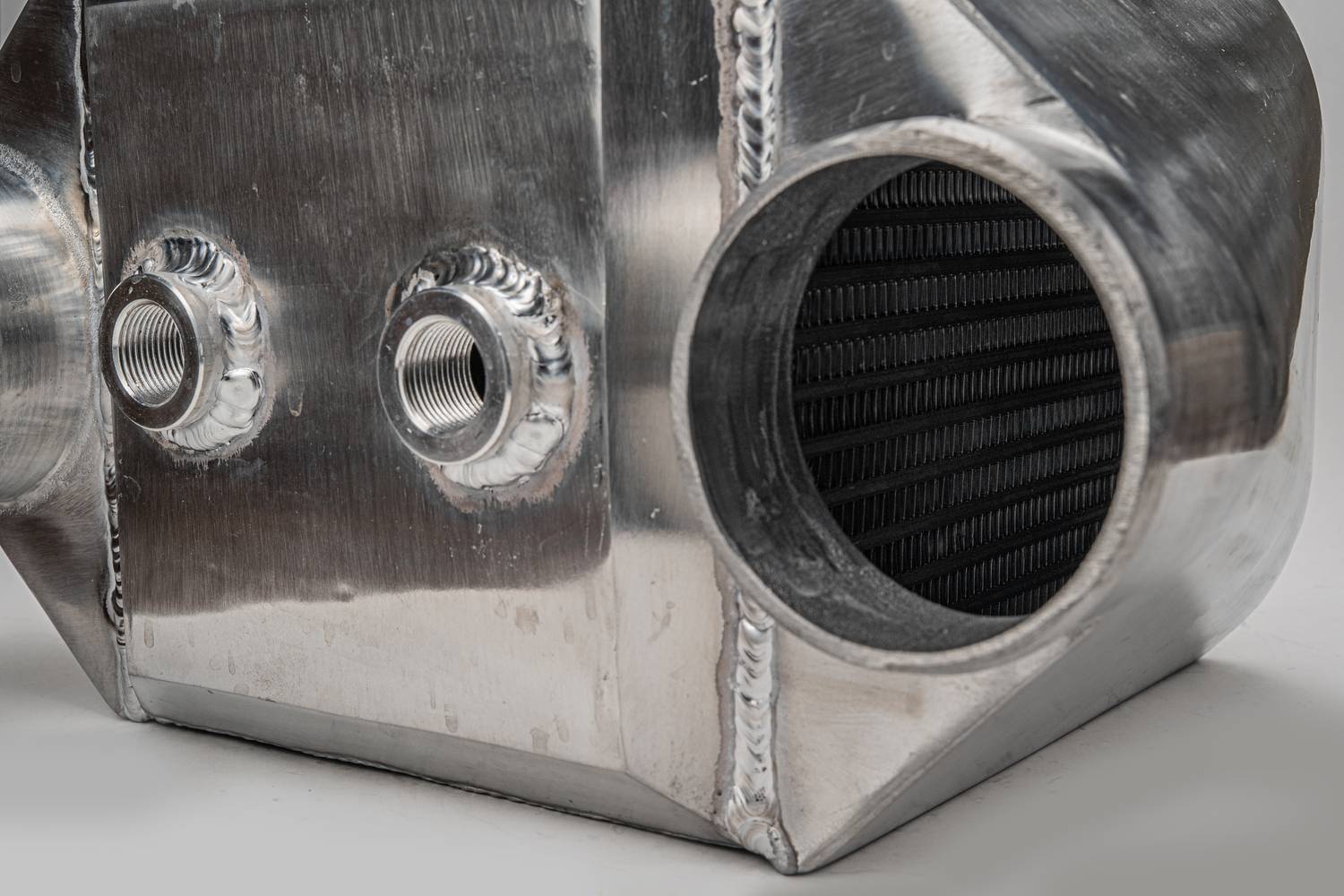 This Liquid/Air intercooler is built for massive boost. Special innovations in the core and end tanks allow it to operate at continuous pressure of up to 150 PSI.