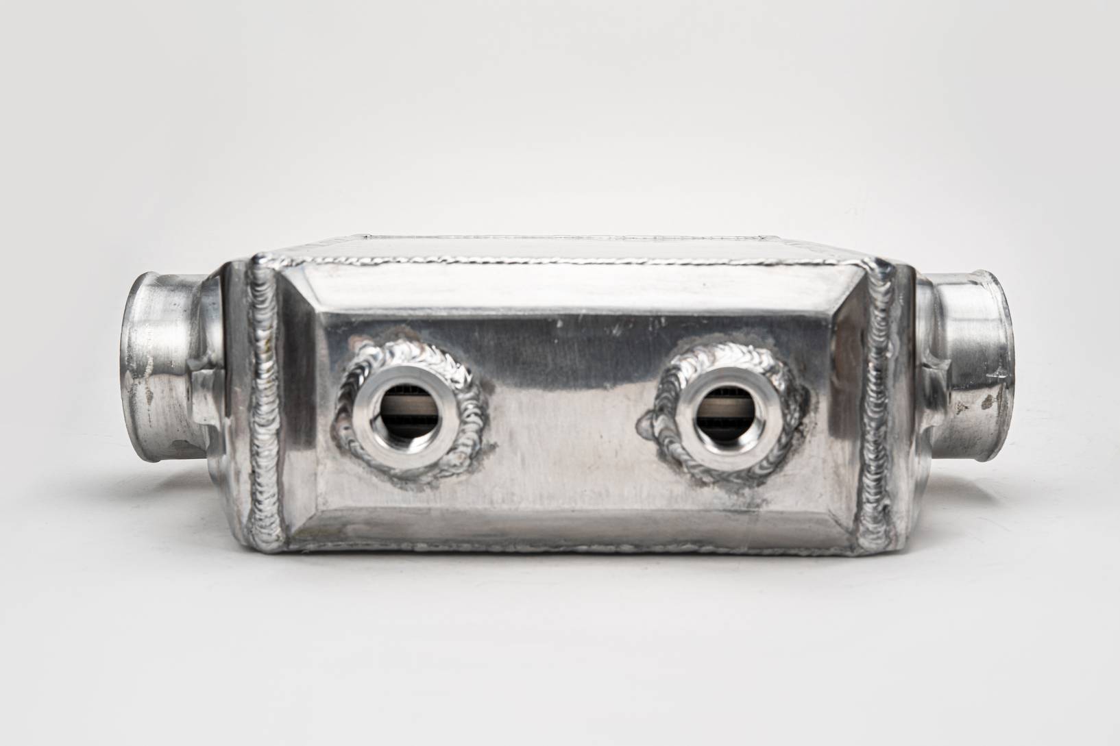 The inlet and outlet on this intercooler go directly through the intercooler; preventing the air from changing direction can result in better airflow.